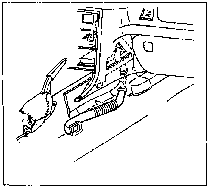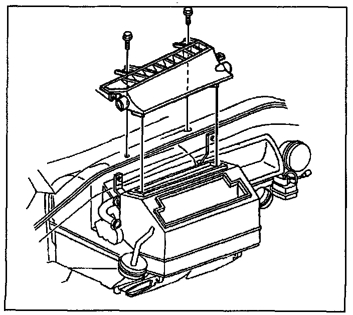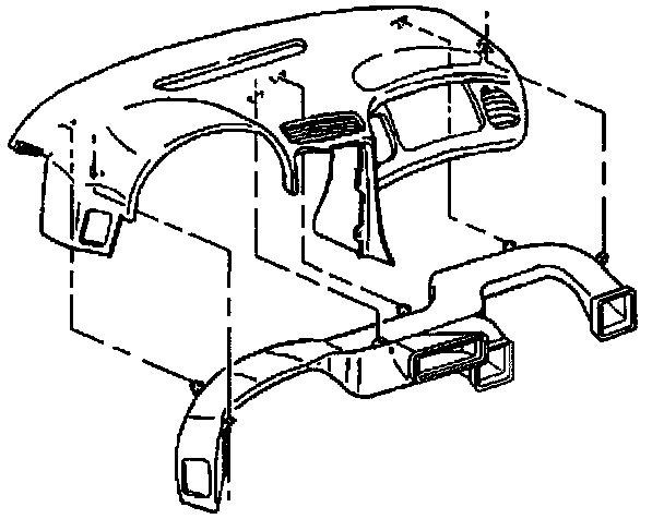 The A/C distributor is fastened to the bottom of the upper instrument pad. The distributor receives air through the HVAC module and A/C valve and channels the air to the driver, center, and passenger A/C outlets. Air is also allowed to flow to the side window defroster outlets and to the floor heater outlets.