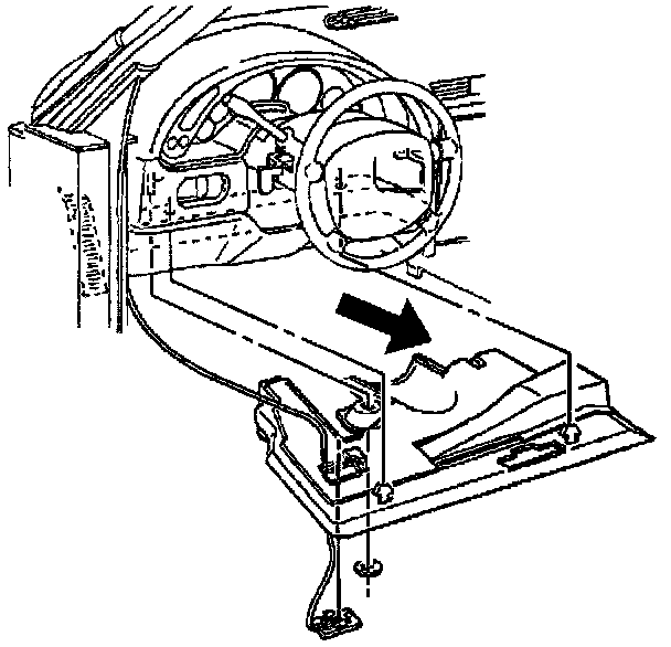 5. Lower and remove the closeout panel. Release the notch in the RH forward edge of the closeout panel from the tab on the accelerator pedal bracket.