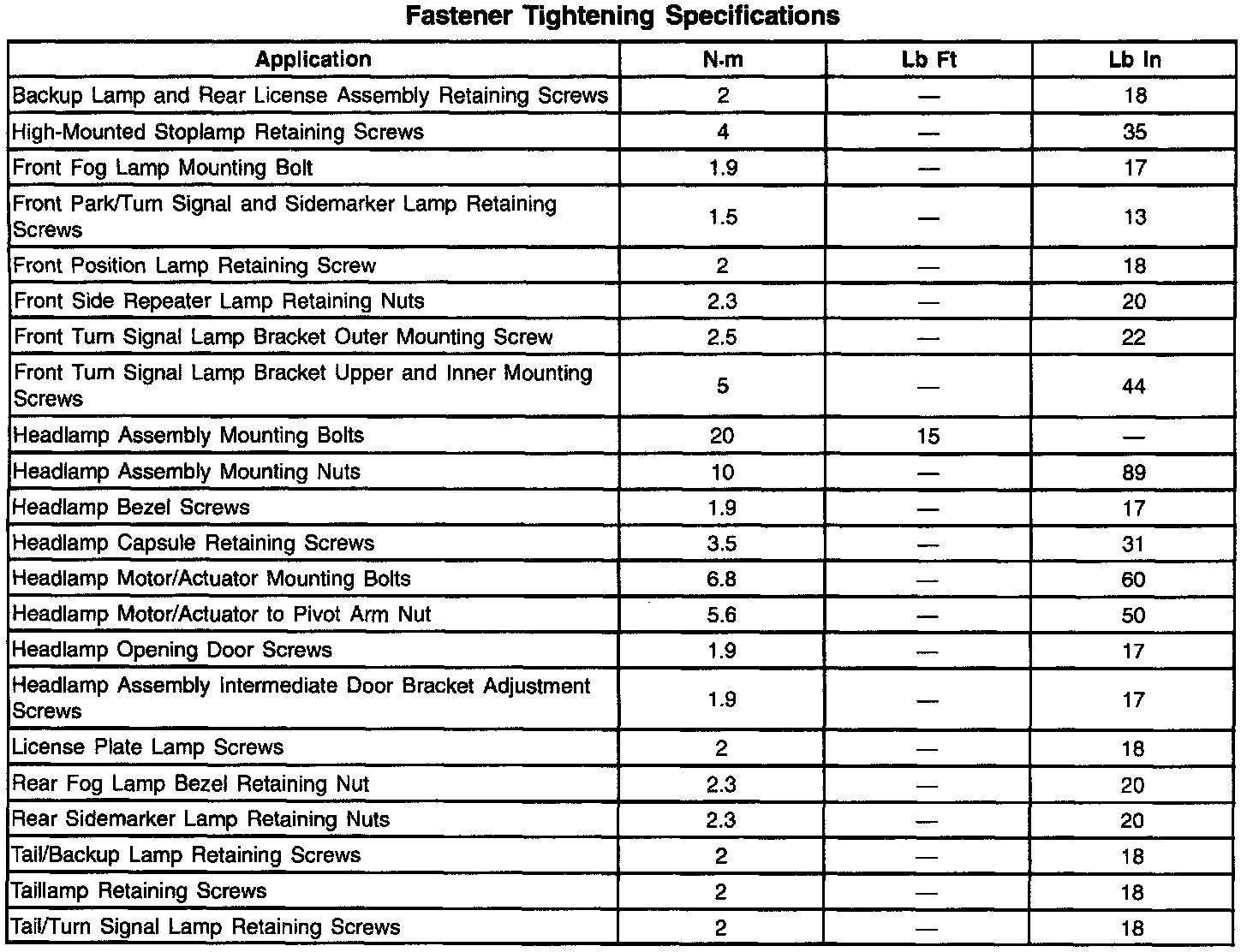 Fastener Tightening Specifications: