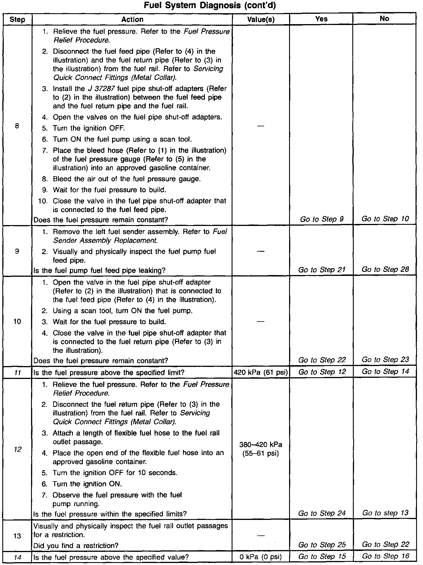 12. This test determines if the high fuel pressure is due to a restricted fuel return pipe or if the high fuel pressure is due to a faulty fuel pressure regulator.