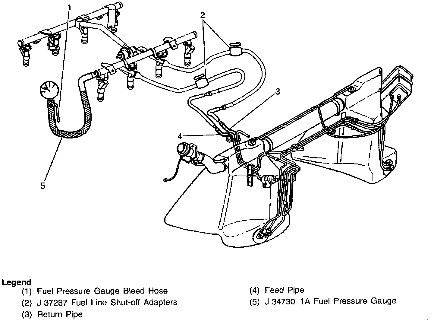 The in-tank fuel pump is an electric pump attached to the fuel sender assembly inside the left fuel tank. The in-tank fuel pump supplies fuel through an in-pipe fuel filter to the fuel rail assembly. The in-tank fuel pump also supplies fuel to the right fuel tank siphon jet pump in order to transfer fuel from the right fuel tank to the left fuel tank. The fuel pump provides fuel at a pressure above the pressure needed by the fuel injectors. A fuel pressure regulator, attached to the fuel rail, keeps the fuel available to the fuel injectors at a regulated pressure. Unused fuel returns to the left fuel tank by a separate fuel return pipe.
