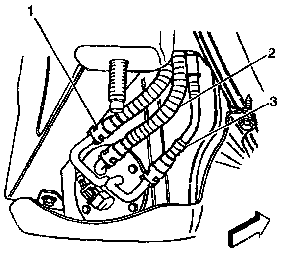8. Connect the fuel sender fuel feed pipe (1) (jet pump to left tank), the fuel return rear pipe (2), and the fuel feed rear pipe (3). Refer to Quick Connect Fittings (Plastic Collar).