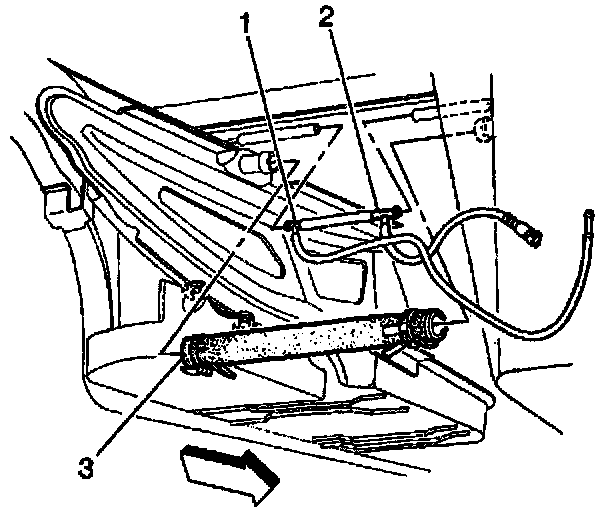 10. Disconnect the fuel sender fuel feed pipe (1) (jet pump to left tank), the fuel return rear pipe (2), and the fuel feed rear pipe (3) at the fuel sender. Refer to Quick Connect Fittings (Plastic Collar).