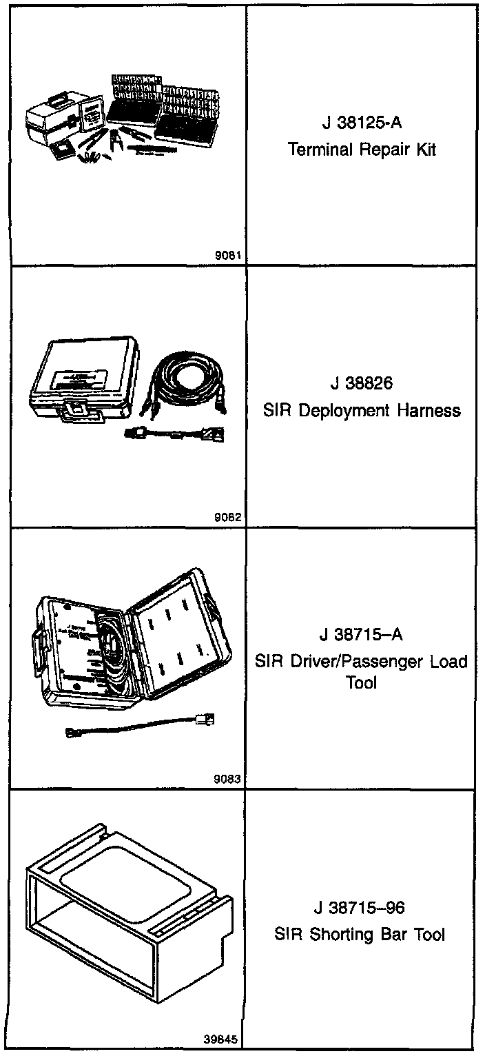 Use J 38125-A Terminal Repair Kit for SIR wiring repair. This kit contains a special crimping tool, heat torch, and sealed splices. Do not use the terminals in the kit to replace damaged SIR system terminals unless specifically indicated by the terminal package.