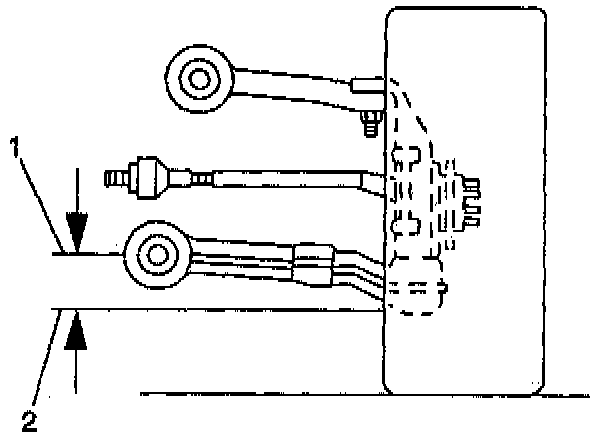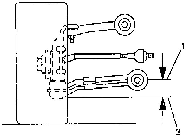 5. Use tool J 42B54 to measure the distance between the lowest point of the left rear ball joint (2) and the center of the front of the forward rear lower control arm bushing mounting bolt (1).