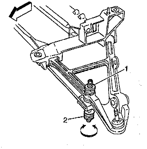 8. Use tool J 42854 to measure the distance between the lowest point of the right rear ball joint (2) and the center of the front of the forward rear lower control arm bushing mounting bolt (1)