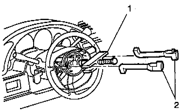 3. Install tools J 1859-A Steering Wheel Puller (1) and J 42120 Steering Wheel Puller Legs (2).