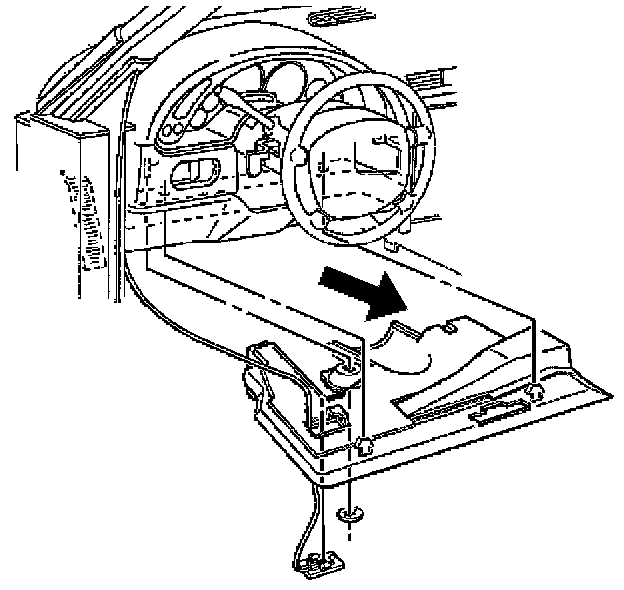11. Lower and remove the closeout panel. Release the notch, in the right-hand forward edge of the closeout panel, from the tab on the accelerator pedal bracket.