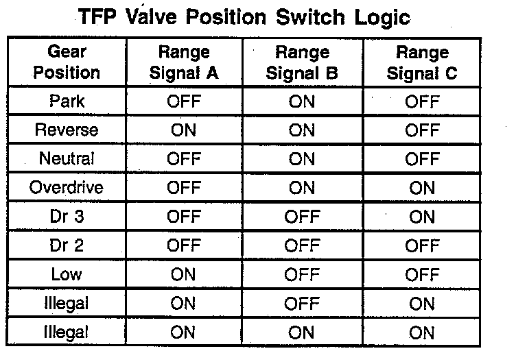In order to monitor the TFP assembly operation, the PCM compares the actual voltage combination of the switches to a TFP combination chart stored in its memory. If the PCM sees one of two illegal voltage combinations, a code P1810 will result. A code P1810 indicates a short circuit condition in either the range signal A or the range signal C circuits.
