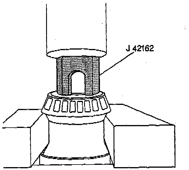 9. Remove the left differential side bearing from the left differential case using J 42162, V-blocks and a hydraulic press.
