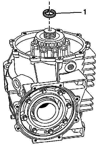 6. Install the pinion housing assembly (2) and the selected shim or shims (1) to the differential housing. Refer to Drive Pinion Shim Selection for shim selection.