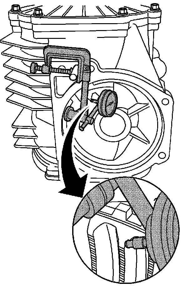 14. Install the J 8001 onto the transmission stud. Position the tip of the dial indicator against the center of the ring gear tooth surface.