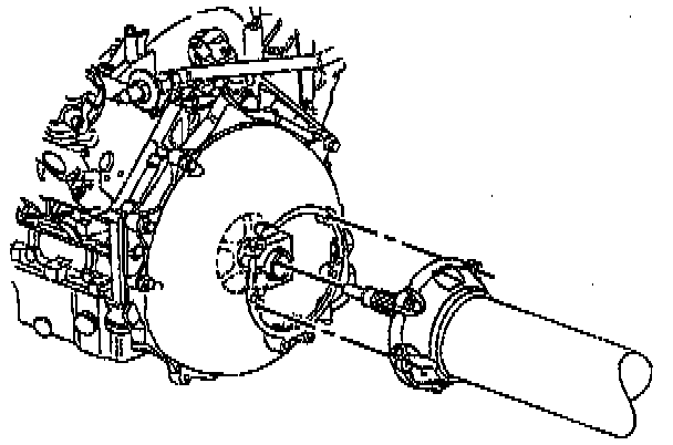 60. SLOWLY lower the driveline, while simultaneously adjusting the angle of tilt and pulling the driveline away from the engine UNTIL the propeller input shaft at the front of the driveline support assembly just clears the engine flywheel housing.