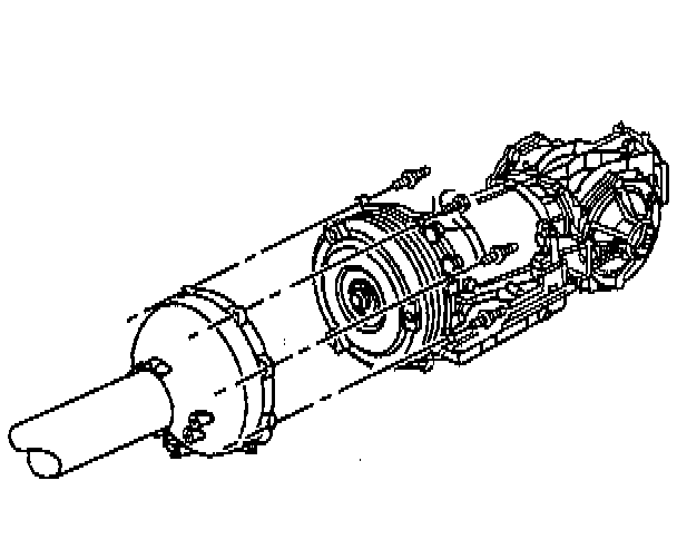 58. Have an assistant insert a flat bladed screwdriver, or similar tool, between the edge of the driveline support assembly and the engine flywheel housing, then begin to pry the driveline loose from the engine.
