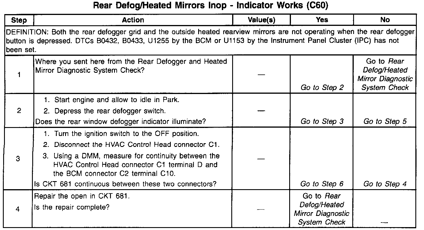 Rear Defog/heated Mirrors INOP: Indicator Works (C60) (Part 1 Of 2):