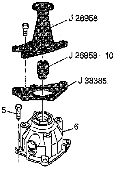 7. Install J 26958, J 26958-10, and J 38385 onto the case extension (6), if you have not yet installed these tools.