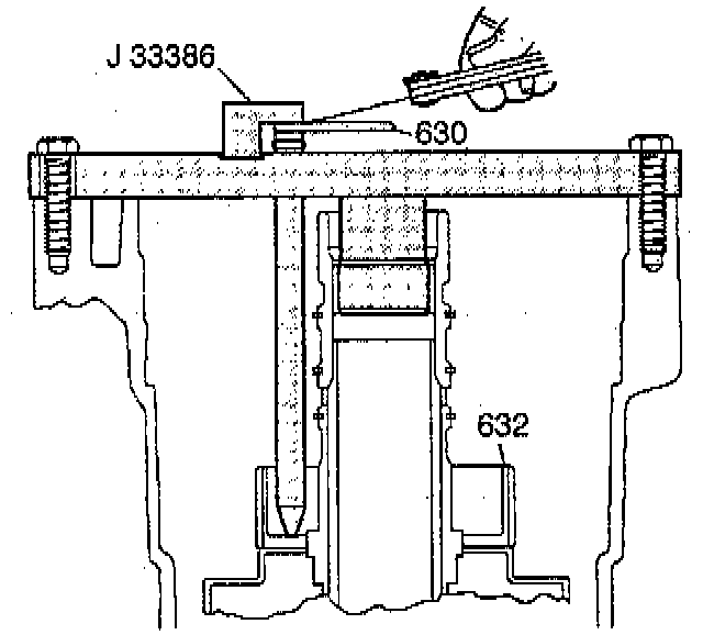 12. Use a feeler gage in order to measure the clearance between J 33386 and the thrust washer (630):