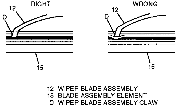^ Slide wiper blade element (15) through wiper blade assembly claws (D) until claws (D) are locked into notches (F) in wiper blade insert (15).