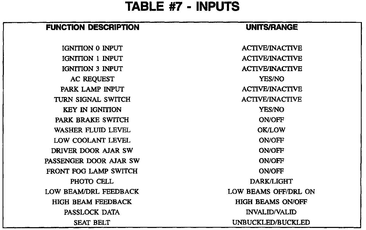 In this mode of operation, the scan tool can command the Body Function Controller (BFC) to read its various inputs. This mode can be used to determine whether the BFC is receiving data correctly or if a component is operating properly. The inputs that can be read are listed on TABLE #7 shown in the above figure.