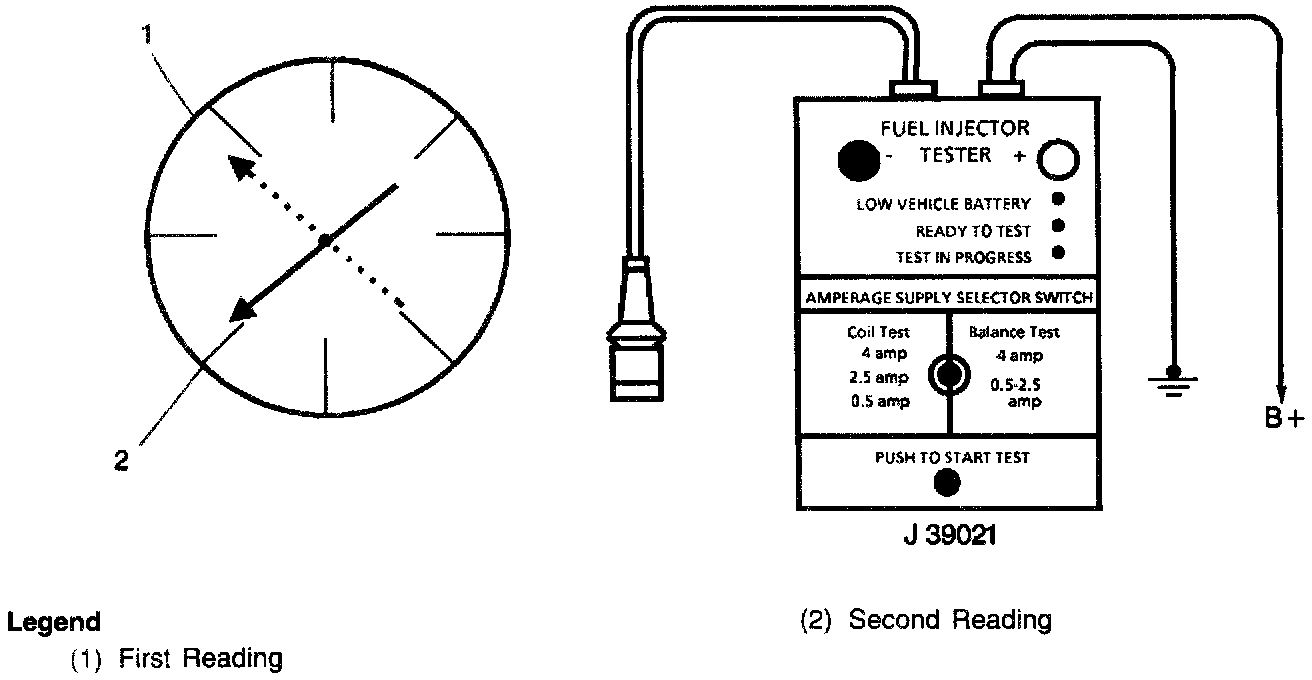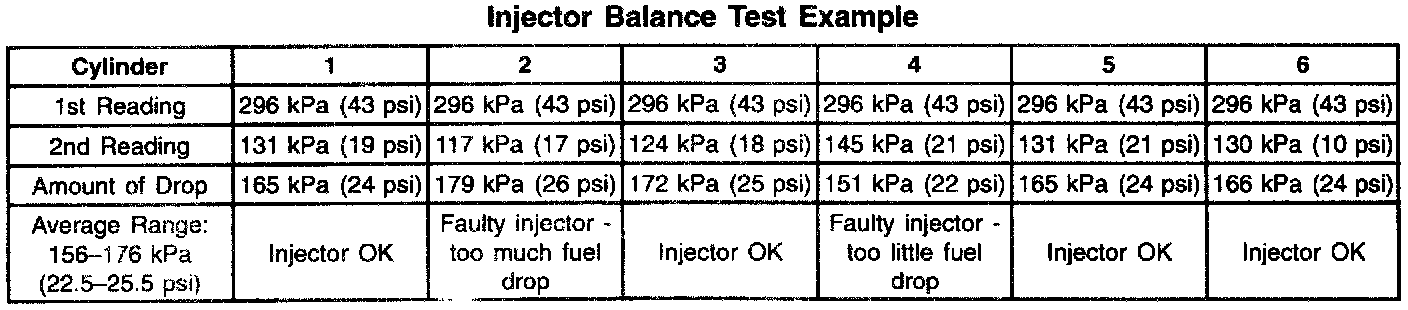 7. If the pressure drop value for each fuel injector is within 10 kPa (1.5 psi) of the average pressure drop value, the fuel injectors are flowing properly. Calculate the pressure drop value for each fuel injector by subtracting the second pressure reading from the first pressure reading'. Refer to the illustration above.