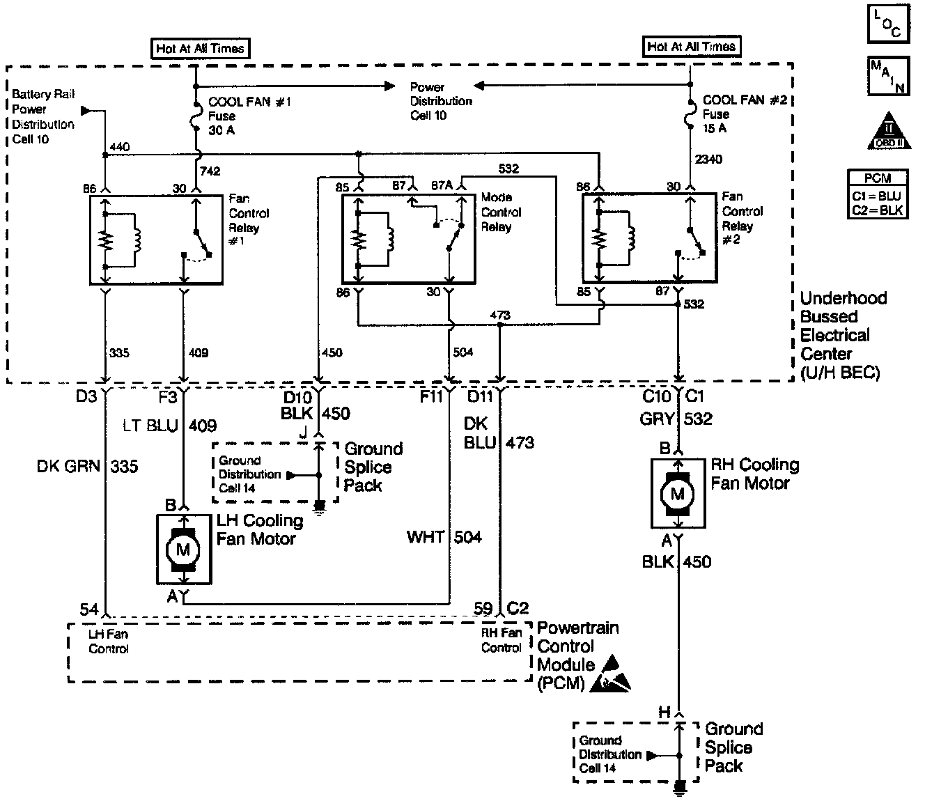 The electric cooling fan(s) are controlled by the PCM The PCM controls the around path for the three cooling fan relays. The relay(s) are used to control the high current flow to power the cooling fan motors. When minimum cooling is required, the PCM will energize cooling fan relay #1 and since both fans are connected in series through the Mode Control relay, both fans will operate at low speed. When maximum cooling is required, the PCM energizes all three cooling fan relays. Power is supplied to the left fan through cooling fan relay #1 and is grounded through the Mode Control relay. The right Ian is powered directly through cooling Ian relay #2 causing both fans to operate at high speed.