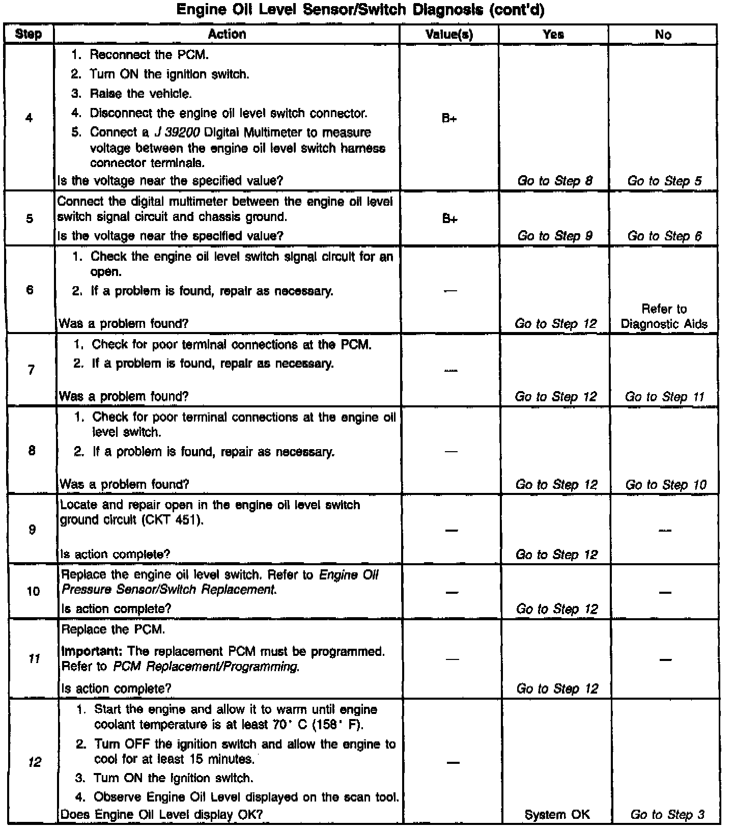 - Engine Oil Level Switch circuit: If the problem with the Low Oil Level lamp can not be isolated using the Engine Oil Level Switch Diagnostic table, use the PCM Controlled Lamps Diagnostic table.
