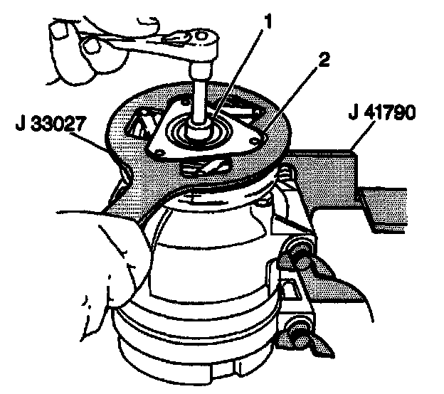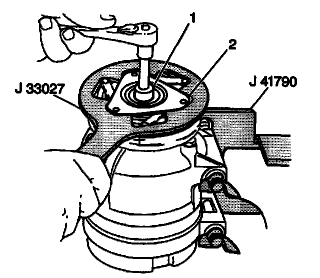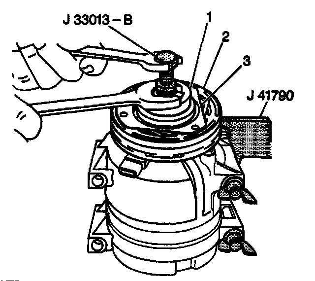 2. Keep the clutch hub and drive plate assembly from turning by using the clutch hub holding tool J 33027-A. Remove the compressor shaft nut using a 13 mm socket (1) (Figure 2).