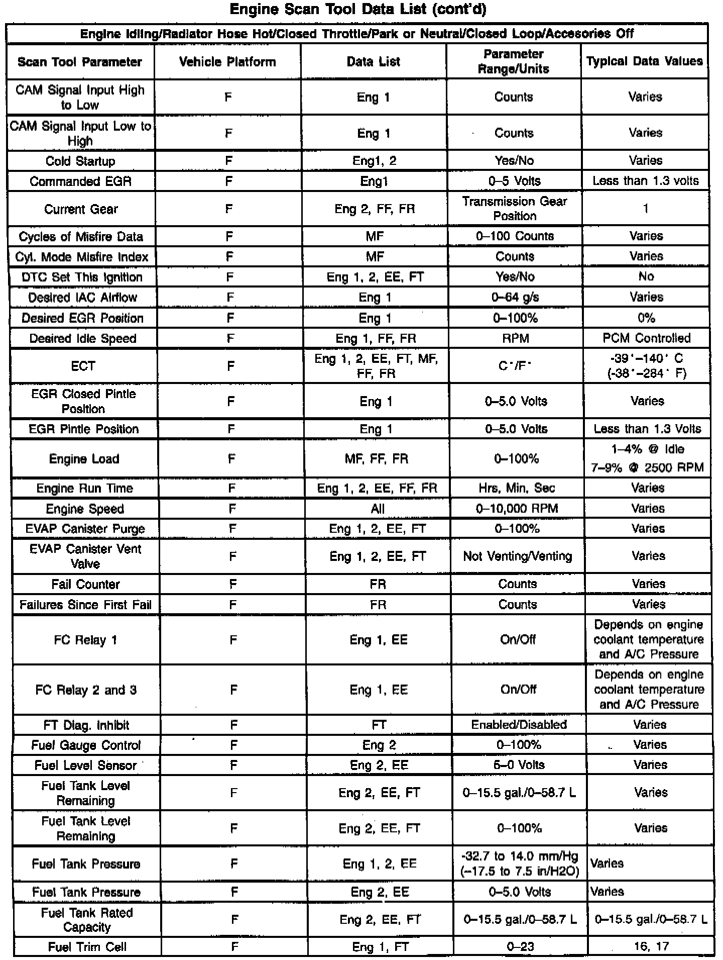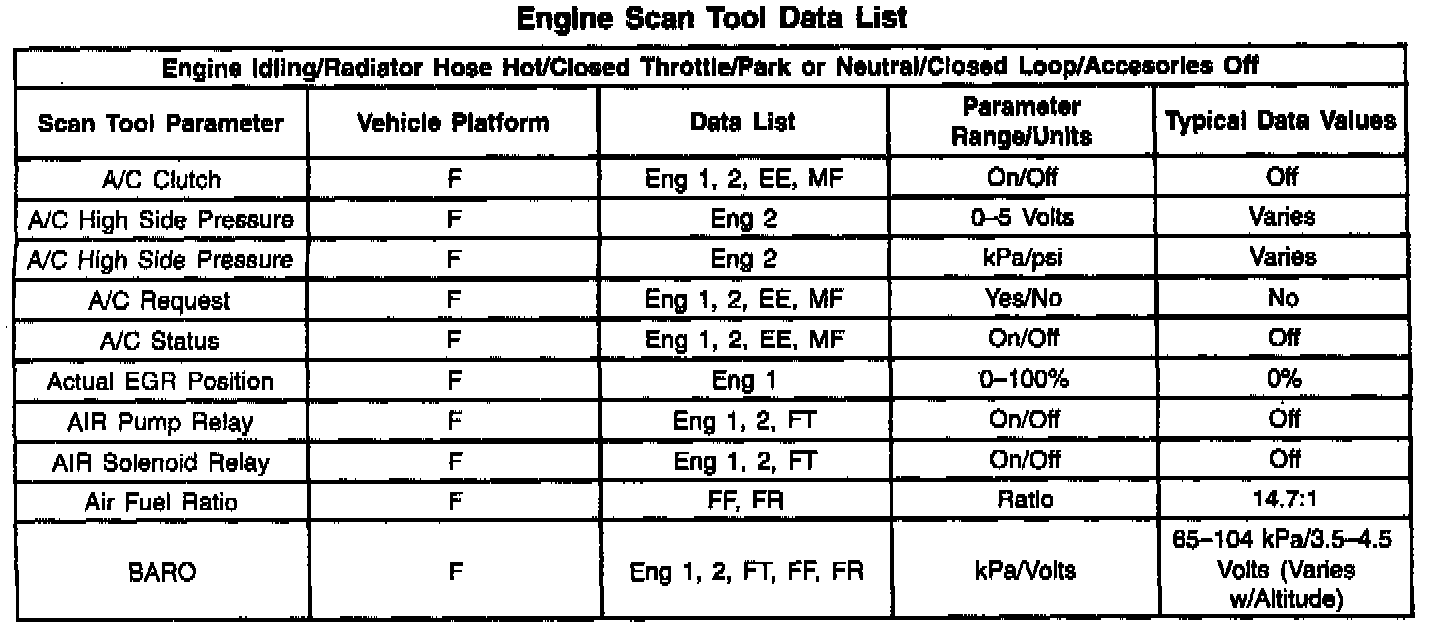 The Engine Scan Tool Data List contains all engine related parameters that are available on the scan tool. The list is arranged in alphabetical order. A given parameter may appear in any one of the data lists, and in some cases may appear more than once, or in more than one data list in order to group certain related parameters together.