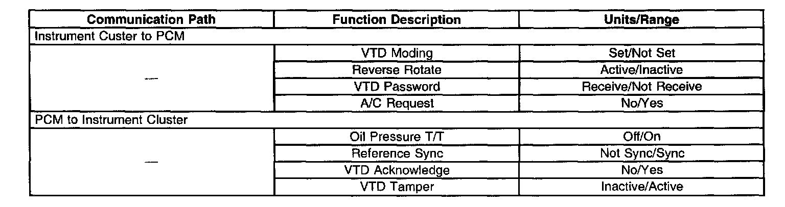 Cranklow: The Cranklow function reads as active when the ignition switch is in the START position. Otherwise, the function will read as inactive.VTD Option: The vehicle theft deterrent (VTD) function indicates whether the instrument cluster has detected the presence of a passlock(TM) lock cylinder. When the detection occurs, the instrument cluster sets the VTD Option function to YES.