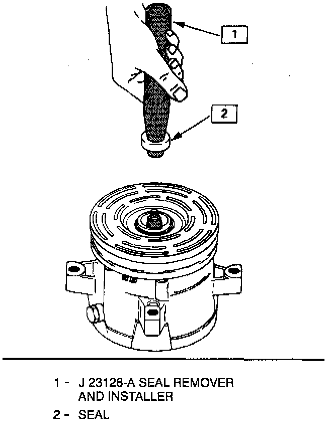 6. Fully engage the knurled tangs of seal remover-installer J2312-A into the recessed portion of the seal by turning the handle clockwise. Remove the seal from the compressor with a rotary-pulling motion. Discard the seal. The handle should be hand-tightened securely. Do not use a wrench or pliers.