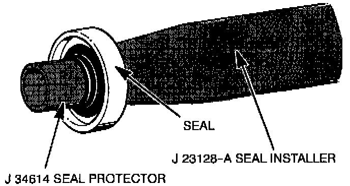 3. Dip the new seal in clean 525 viscosity refrigerant oil and assemble seal to Seal Installer J 23128-A, by turning handle clockwise. The stamped steel case side of the lip seal must be engaged with knurled tangs of installer so that flared-out side of lip seal is facing and installed towards the compressor. Install shaft seal protector J 34614 on the lip seal. Place the seal protector J 34614 over end of compressor shaft, and slide the new seal onto the shaft with a rotary motion until it stops. Take care not to dislodge the O-ring. Be sure the seal makes good contact with the O-ring. Disengage the installer from the seal and remove the installer J 23128-A and the shaft seal protector J 34614.