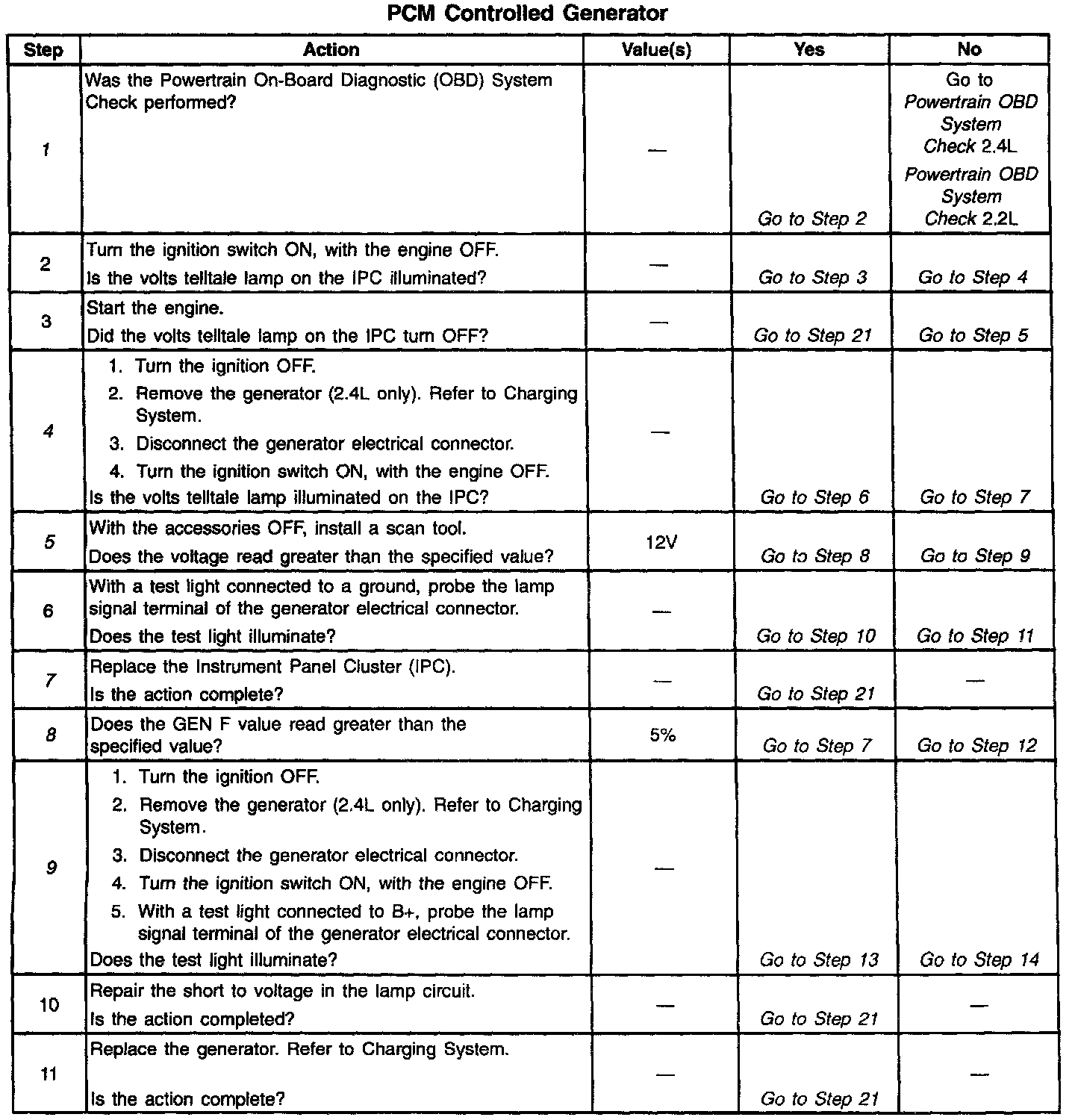 ^ If the generator terminal F input circuit is shorted to voltage, the volts telltale lamp will operate normally. However, the scan tool Generator PWM will display a generator duty cycle near 10%. Check the generator terminal F input circuit for a short to voltage. If OK, the generator may be faulty, refer to Charging System.