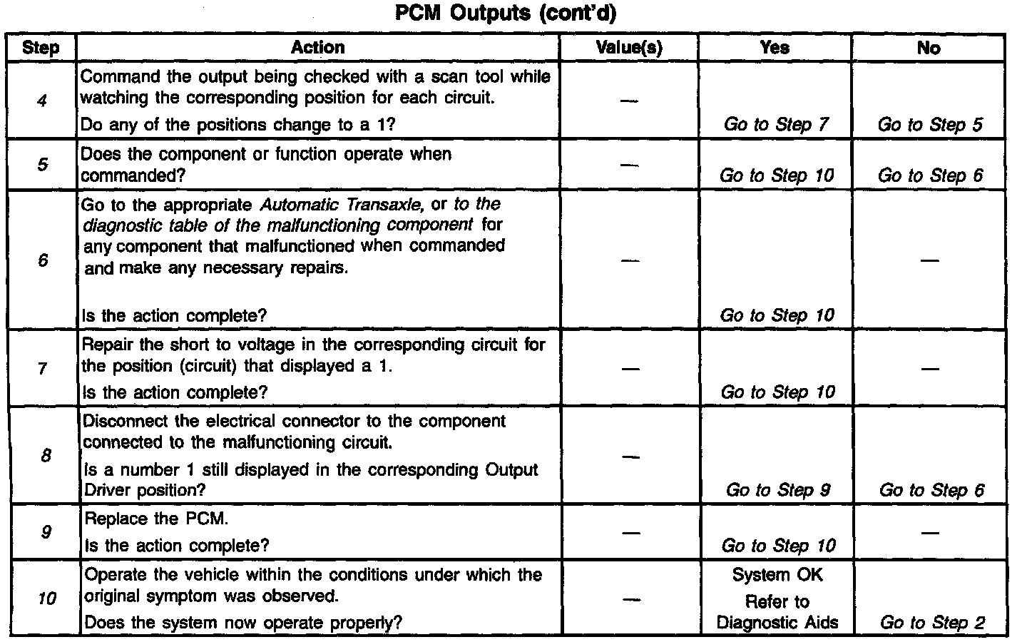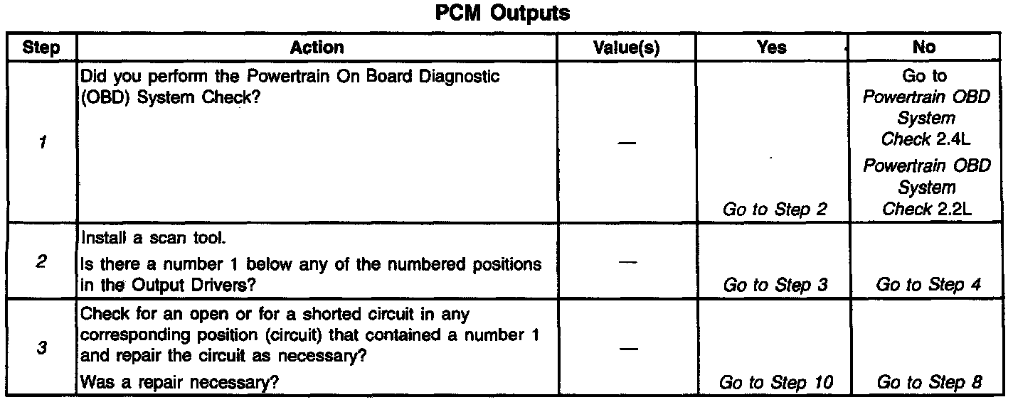 The following table will diagnose the PCM controlled outputs from the output driver modules only. For diagnosis of the cooling fan circuit, refer to Electric Cooling Fan Diagnosis. Electric Cooling Fan Diagnosis For diagnosis of the cruise control module circuit, refer to Cruise Control Diagnosis. System Diagnosis - Cruise Control
