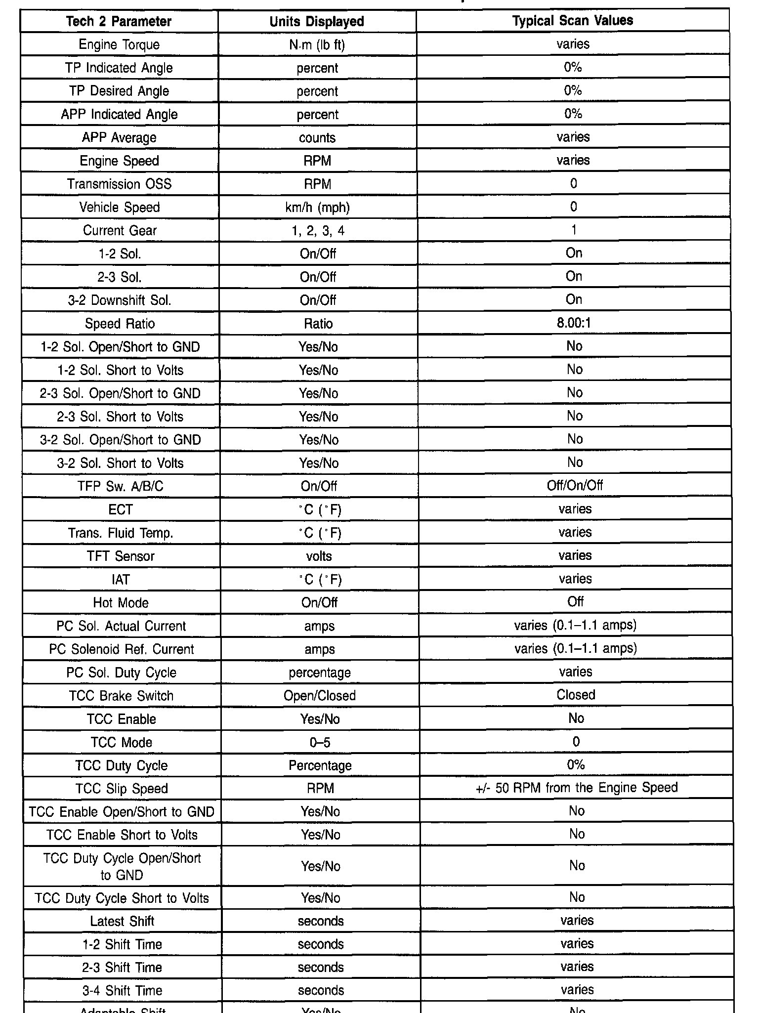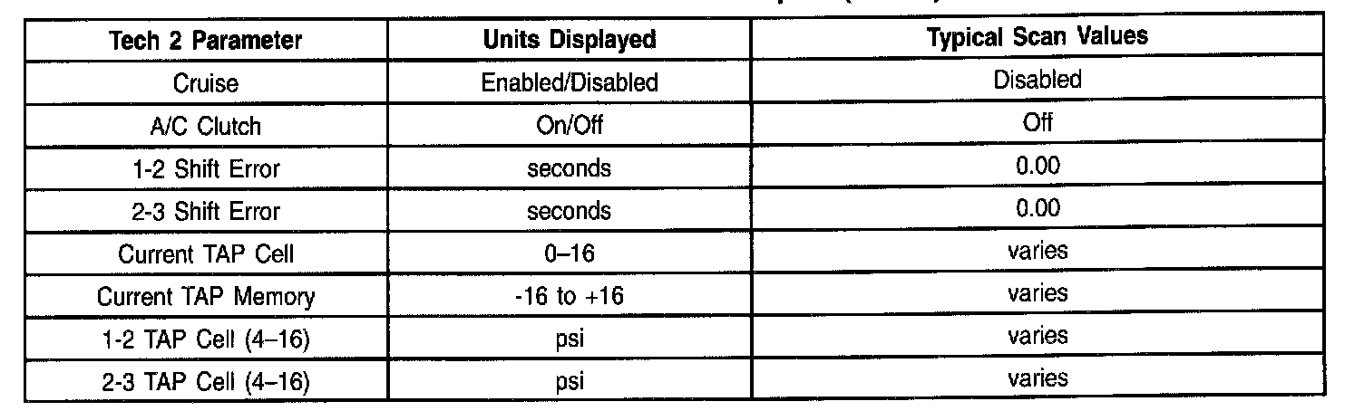 Only the parameters listed below are used in this manual for diagnosing. If a scan tool displays other parameters, the values are not recommended by General Motors for use in diagnosis. The values below were recorded under the following conditions:
