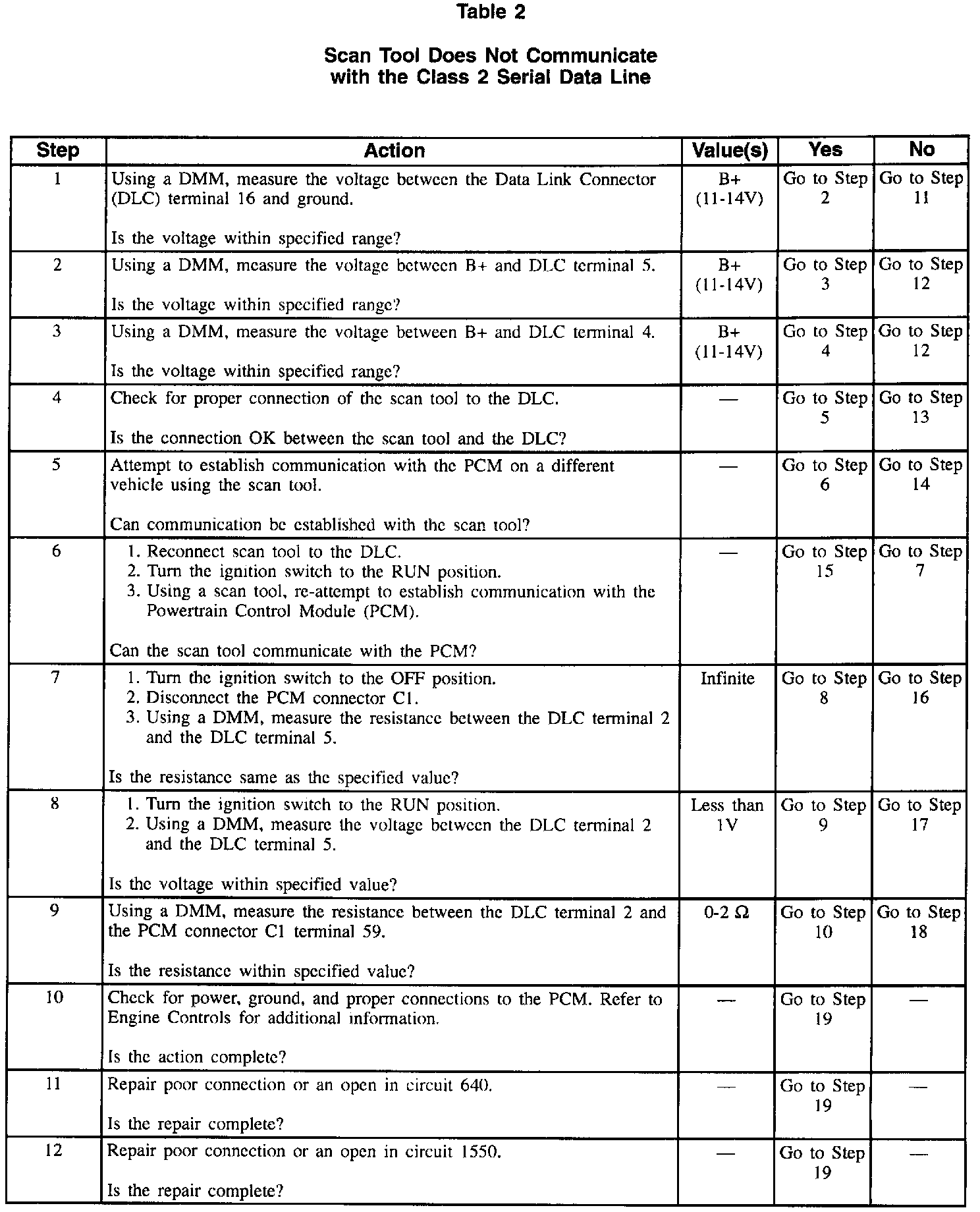 Table 2 Scan Tool Doesn't Communicate W/The Class 2 Serial Data Line (Part 1 Of 2):