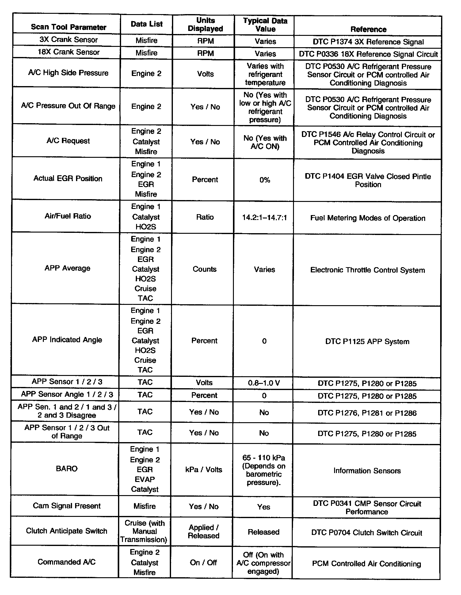 Use the Typical Scan Data Values table only after the Powertrain On-Board Diagnostic System Check has been completed, no DTCs were noted and you have determined the on-board diagnostics are functioning properly. Scan tool values from a properly running engine may be used for comparison with the engine you are diagnosing. The Typical Scan Data values represent values that would be seen on a normally running engine.