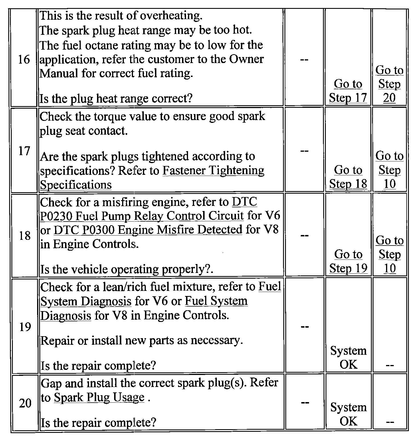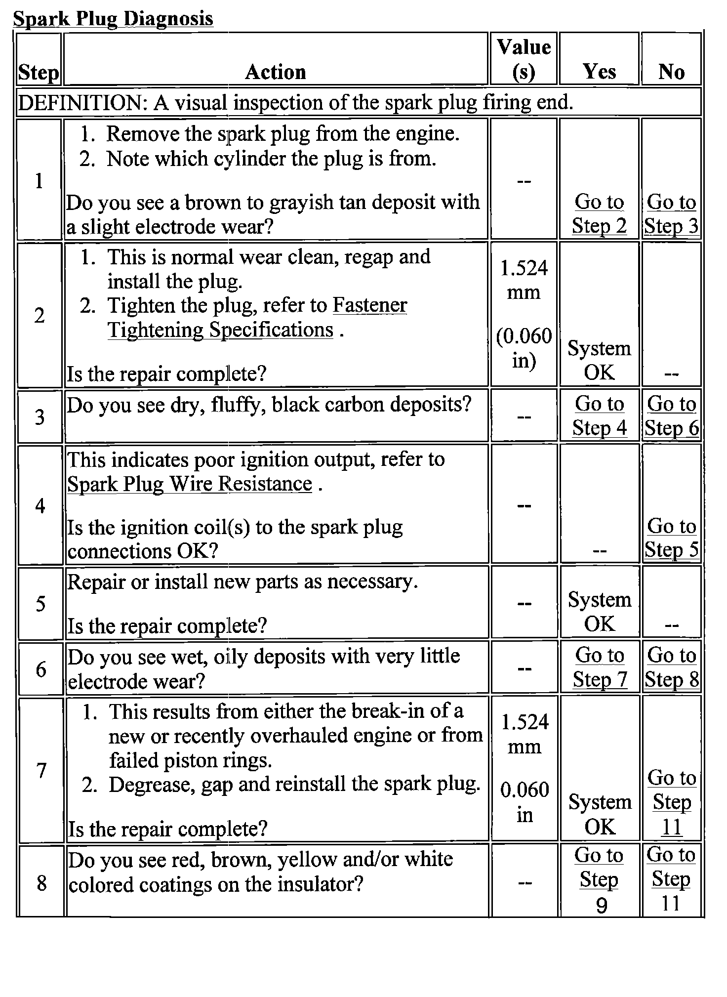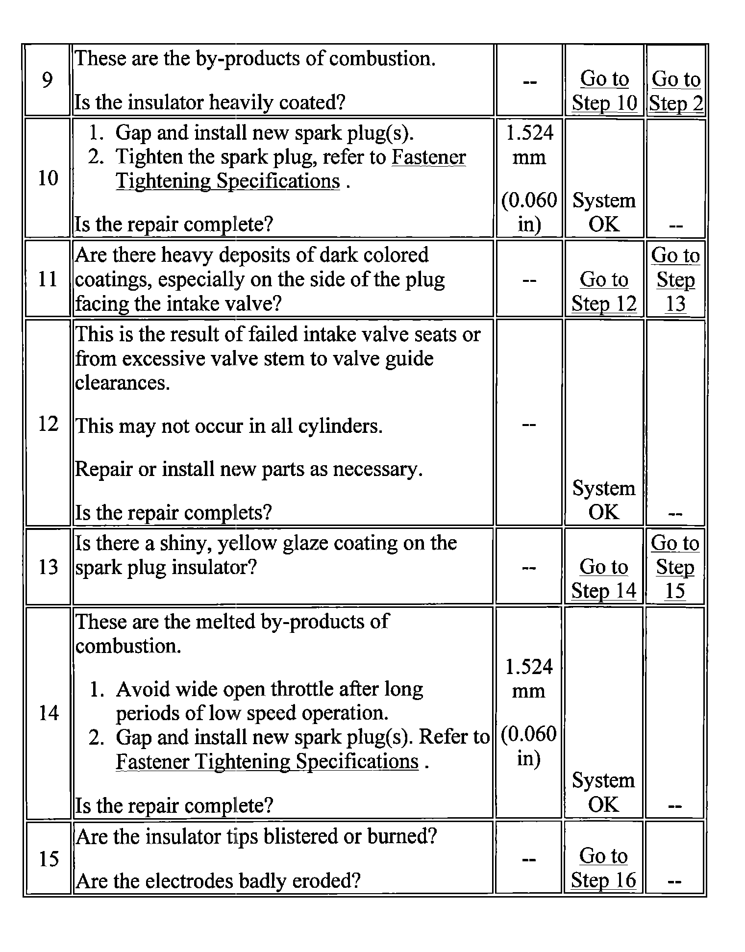 SPARK PLUG VISUAL DIAGNOSISWorn or dirty plugs give satisfactory operation at idling speed, but under operating conditions they frequently fail. Faulty plugs are indicated in a number of ways poor fuel economy, power loss, loss of speed, hard starting and general poor engine performance. Spark plugs may also fail due to carbon fouling, excessive plug gap, or broken insulators. Fouled plugs are identified by black carbon deposits. The black deposits are usually the result of slow speed driving and short runs where sufficient engine temperature is seldom reached. Worn pistons, rings, faulty ignition, over-rich air/fuel mixture and spark plugs which are too cold will also result in carbon deposits. Excessive gap wear, on plugs of low mileage usually indicated the engine is operating at high speeds or loads that are consistently greater than normal or that a plug which is too hot is being used. Electrode wear may also be the result of plug overheating due to insufficient spark plug torque or too much spark plug torque. An excessively lean air/fuel mixture will also result in excessive electrode wear.
