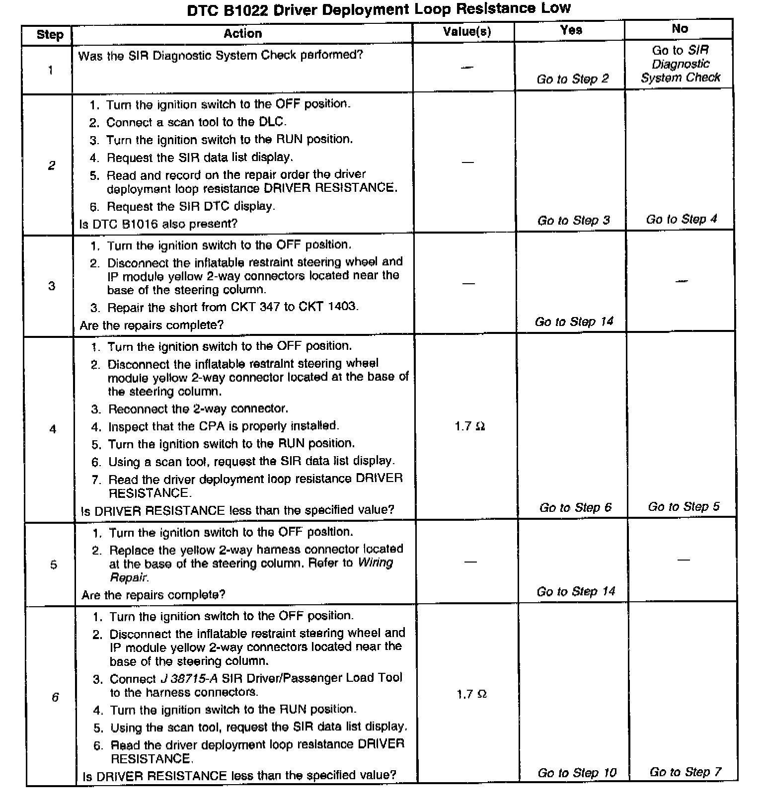 6. This test isolates the malfunction to one side of the Inflatable Restraint Steering Wheel Module Coil yellow 2-way connector.