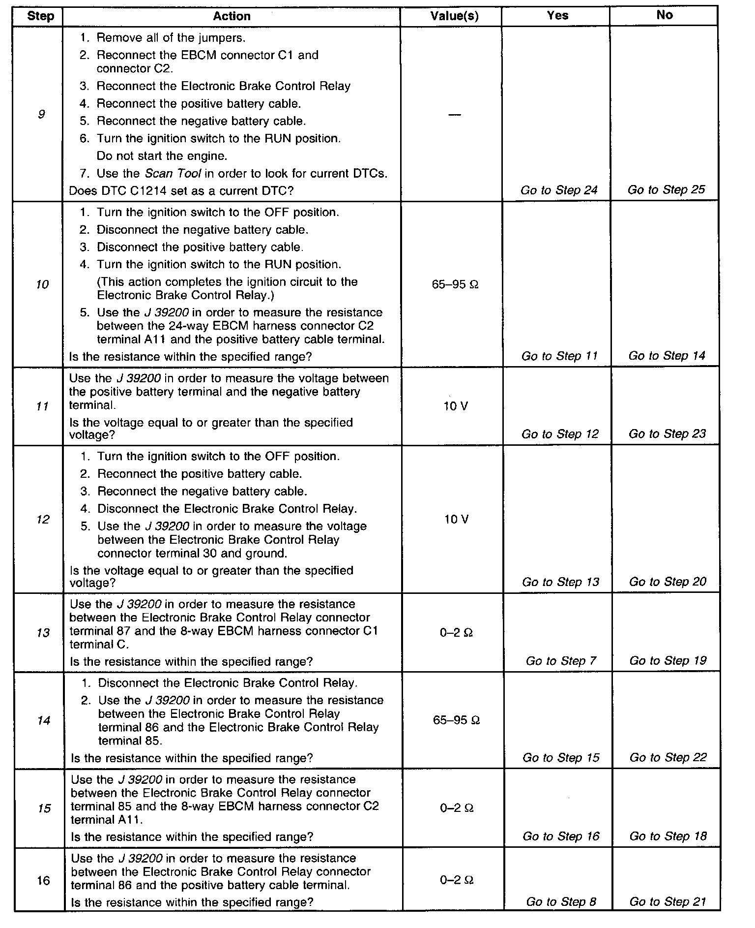 2. If the Electronic Brake Control Relay voltage changes significantly, replace the Electronic Brake Control Relay. If DTC C1214 only sets when the vehicle is initially started in cold ambient conditions (temperature less than O°C (32°F)), replace the Electronic Brake Control Relay.