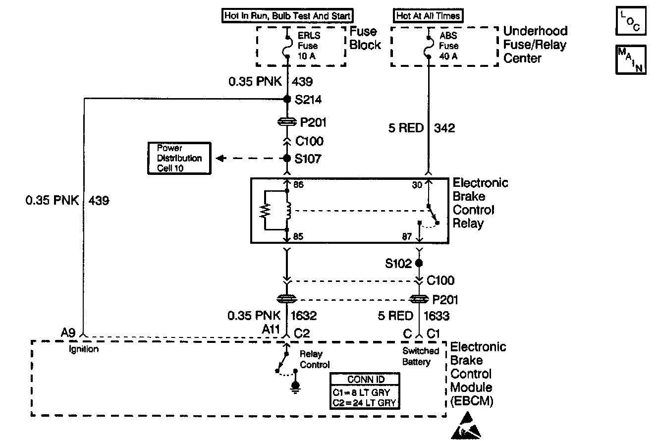 Ignition voltage is supplied to terminal 86 of the Electronic Brake Control Relay. The above condition enables the EBCM to energize the pullin coil by completing the ground circuit at connector C2 terminal Al1 of the EBCM. The magnetic field created closes the Electronic Brake Control Relay contacts.