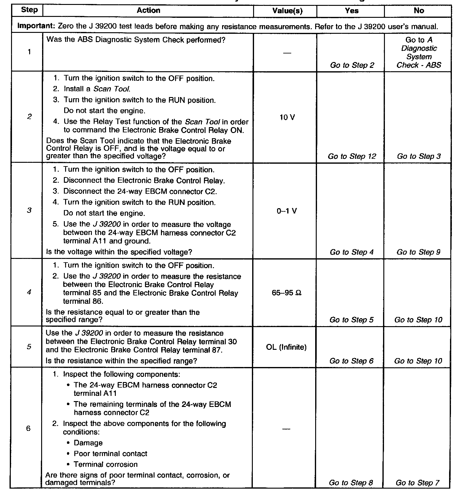 2. This test determines if the EBCM is capable of controlling the electronic brake control relay as commanded.