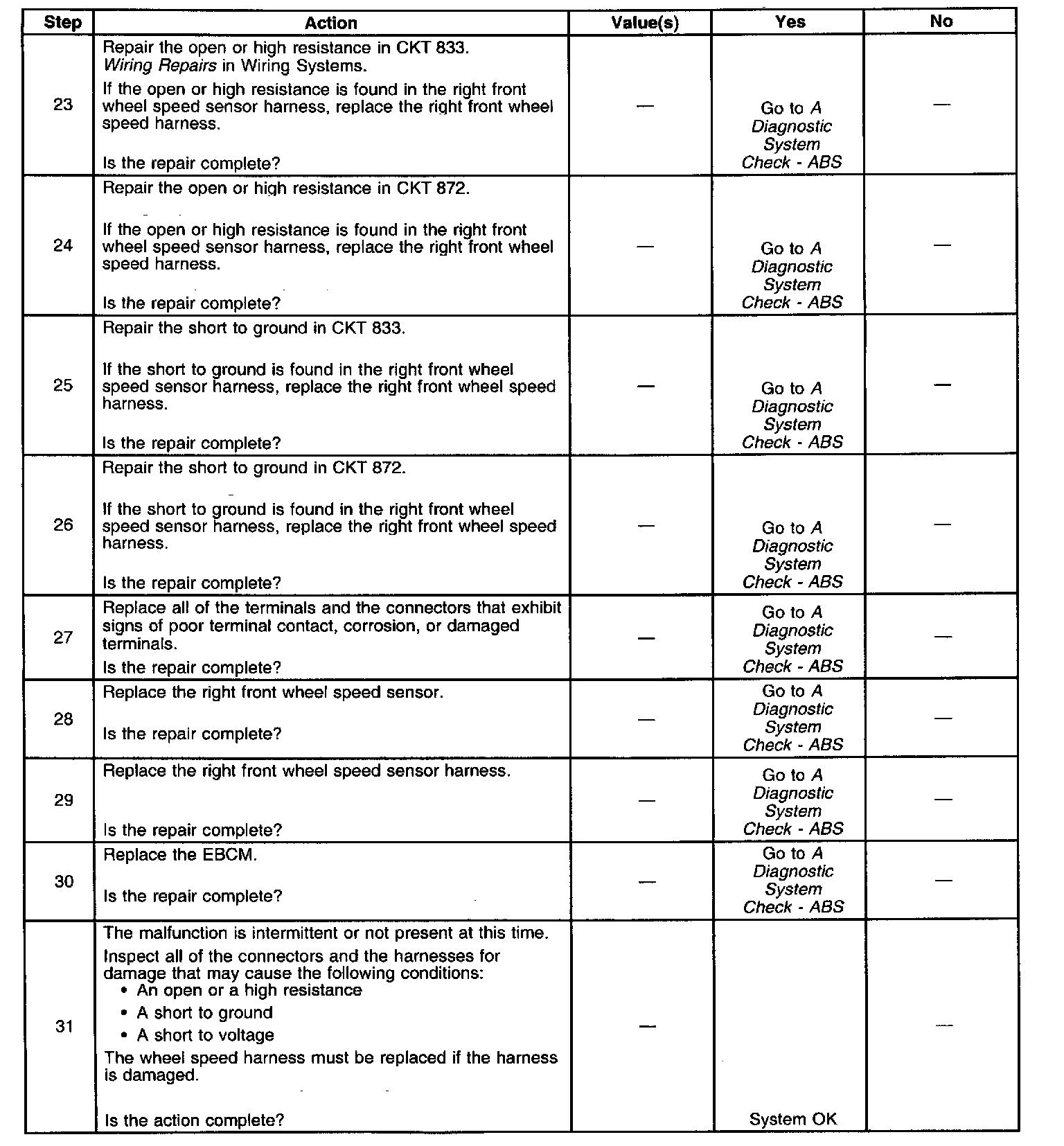 A malfunction exists if either of the right front wheel speed sensor circuits are open or shorted to voltage or ground.