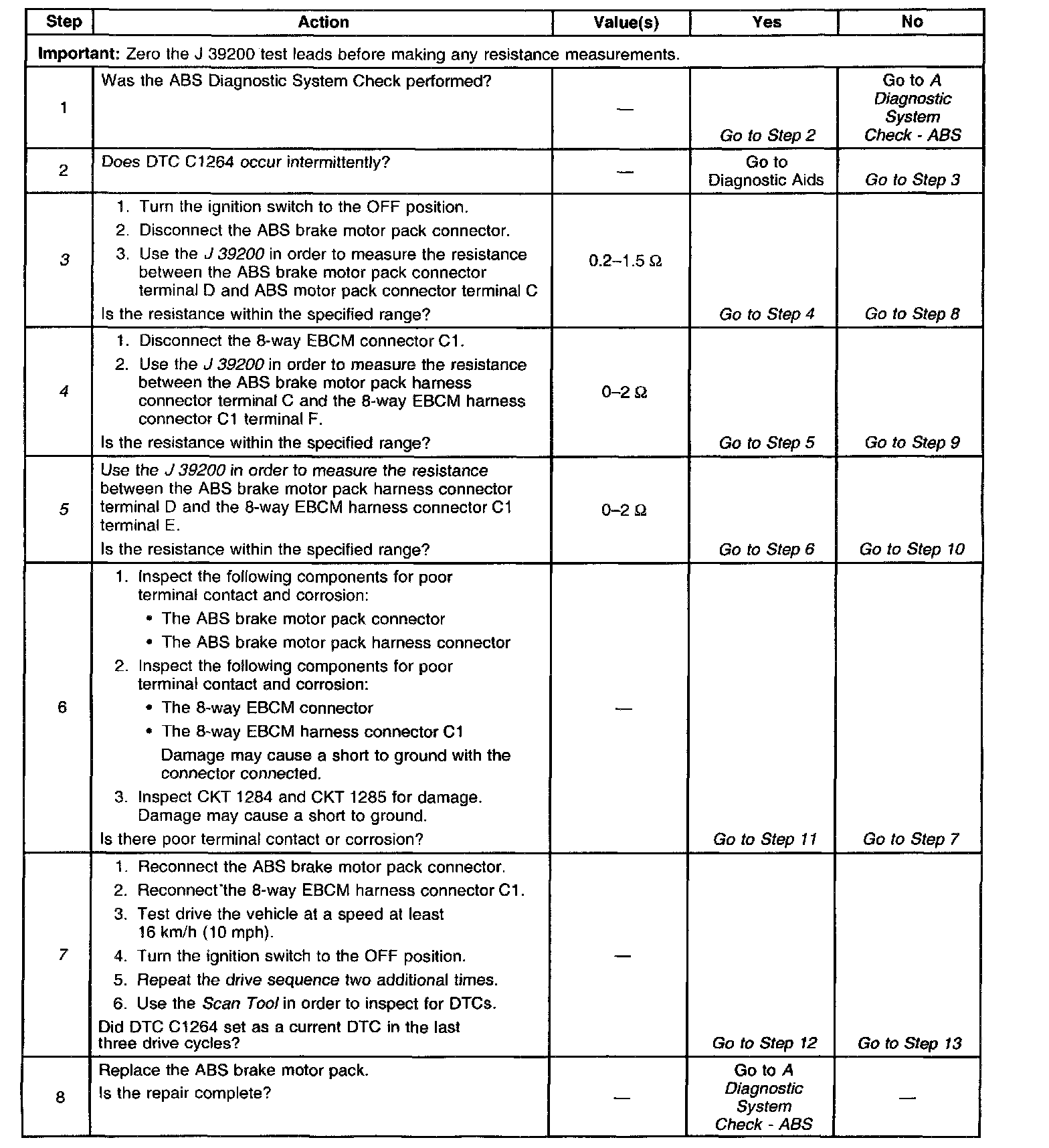 DTC 1264 identifies an ABS motor that cannot energize due to an open in the ABS motor circuitry. The malfunction will not allow proper rear ABS operation.