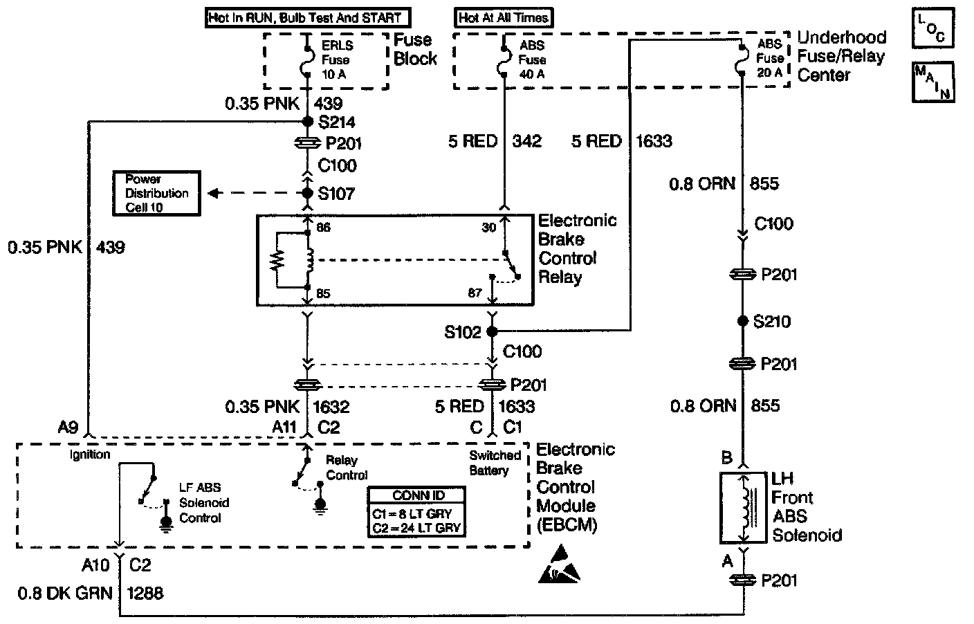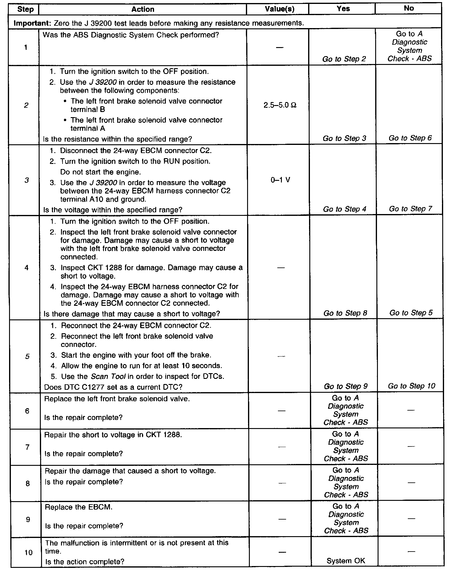 A malfunction exists if the EBCM detects the left front brake solenoid valve control circuit voltage is not within specifications.