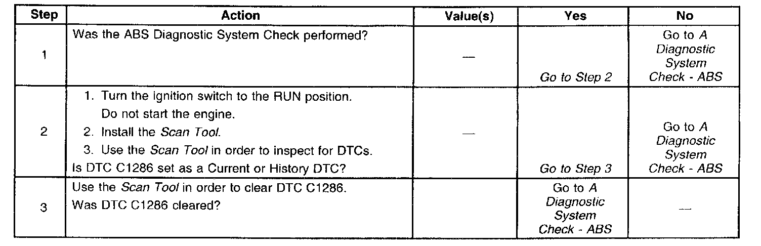 The following ABS mechanical DTCs command the red BRAKE warning indicator to illuminate. The DTCs will also cause the EBCM to store DTC C1286 during shutdown:
