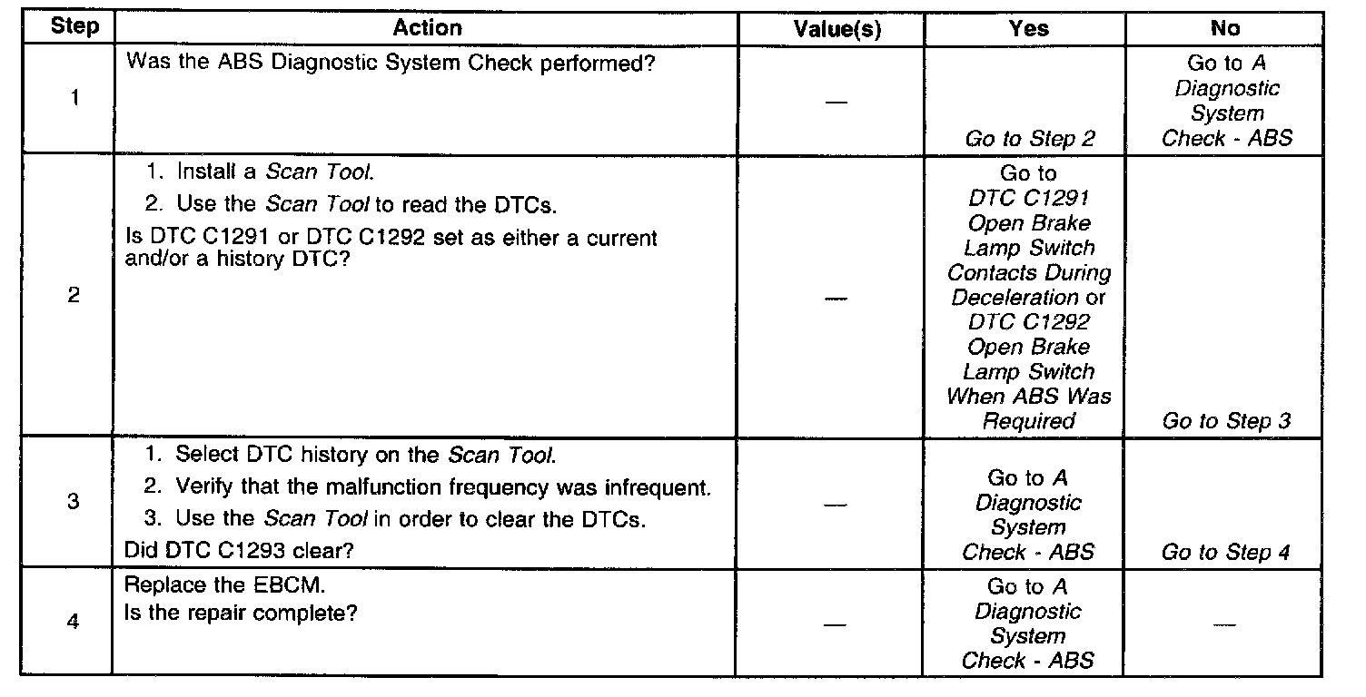 ^ When a change is seen during an ignition cycle in which DTC C1293 is a current malfunction, DTC C1291 or C1292 will clear itself at the end of the current ignition cycle and ABS will enable itself at the start of the next ignition cycle.