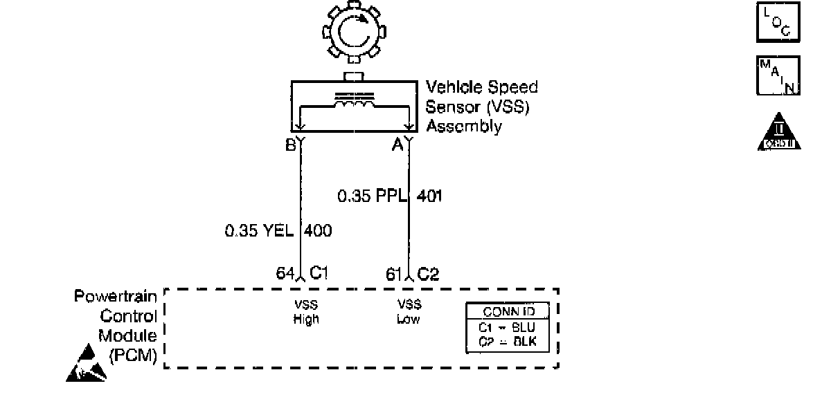 ^ Inspect the wiring at the PCM, the vehicle speed sensor (VSS) assembly connector and all other circuit connecting points for the following conditions: