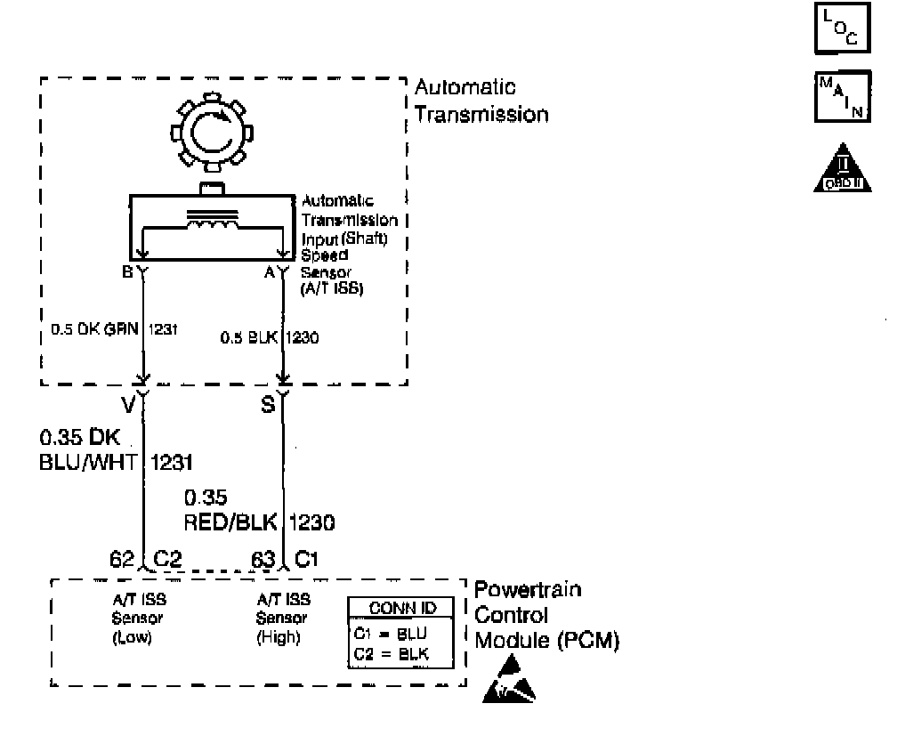 The automatic transmission input (shaft) speed sensor (A/T ISS) provides transmission input speed to the PCM. The A/T ISS is a permanent magnet (PM) generator. The sensor mounts into the transmission case and maintains a slight air gap between the sensor and the drive sprocket. The PM generator produces an AC voltage as the drive sprocket rotor teeth pass through the sensor's magnetic field. The AC voltage level increases as the turbine shaft speed increases. The PCM converts the AC voltage into a digital signal. The PCM determines actual turbine speed using the digital signal. The PCM uses the input speed to calculate torque converter slip speed, and gear ratios.