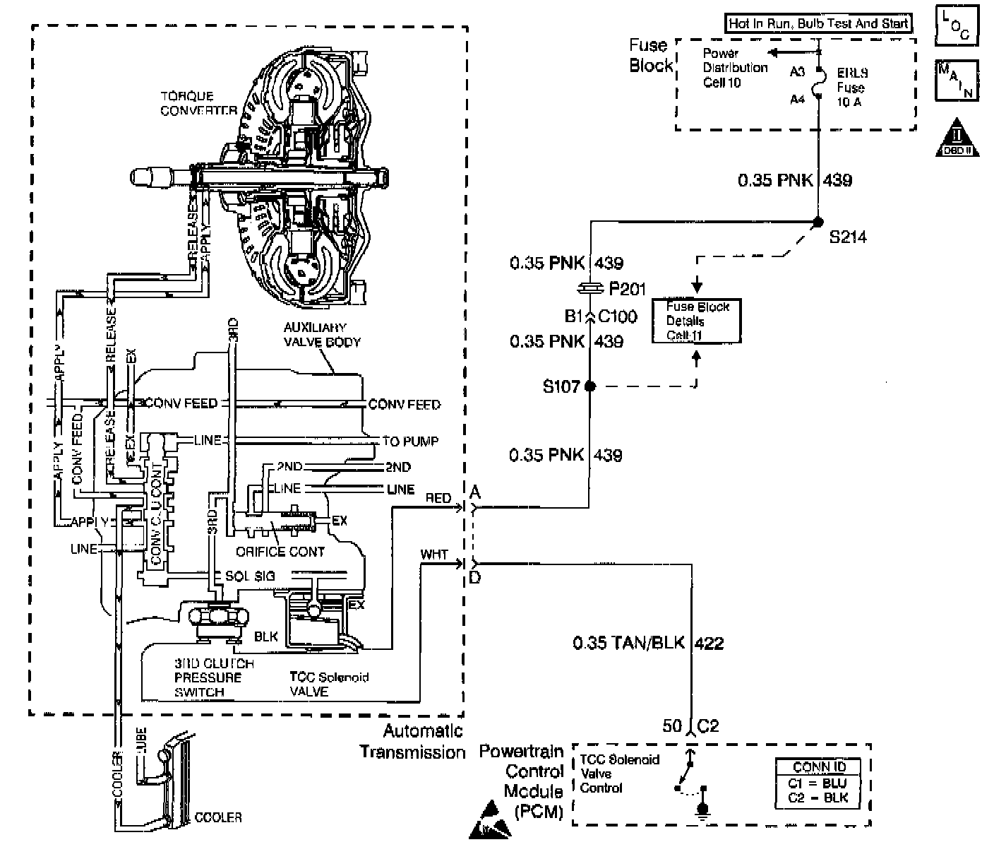 The torque converter clutch solenoid valve (TCC solenoid valve) receives power from the fuse panel on circuit 439. The normally-open 3rd clutch pressure switch interrupts the ground path from the Torque Converter Clutch (TCC) solenoid valve. The powertrain control module (PCM) activates the TCC solenoid valve by grounding the circuit through an internal switch in the PCM. Although the PCM commands the TCC solenoid valve On, the converter clutch does not apply until the 3rd clutch oil (3rd clutch engaged) closes the pressure switch, completing the circuit. Activating the TCC solenoid valve blocks exhaust fluid. This moves the converter clutch control valve to the applied position, and provides fluid pressure to engage the torque converter clutch.