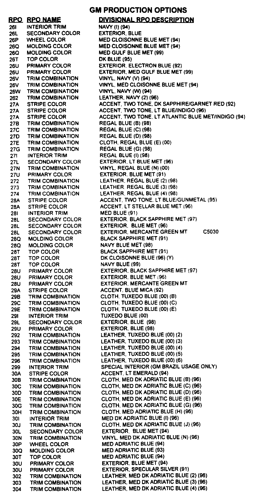 RPO Code List